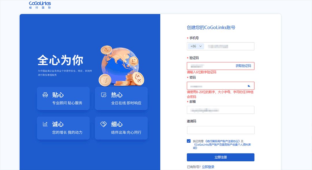 继续点击“立即注册”,开通CoGoLinks结行国际账户!
