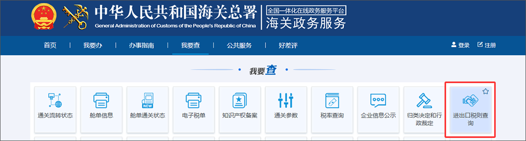 进入中国海关官网 → 互联网+海关 → 我要查 → 进出口税则查询