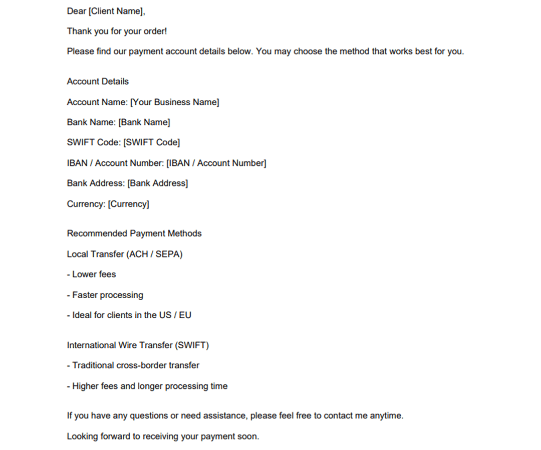 下面是 自然专业、可直接发给客户的英文版收款信息模板,语气正式但友好,不会显得像 AI 翻译,可直接使用: